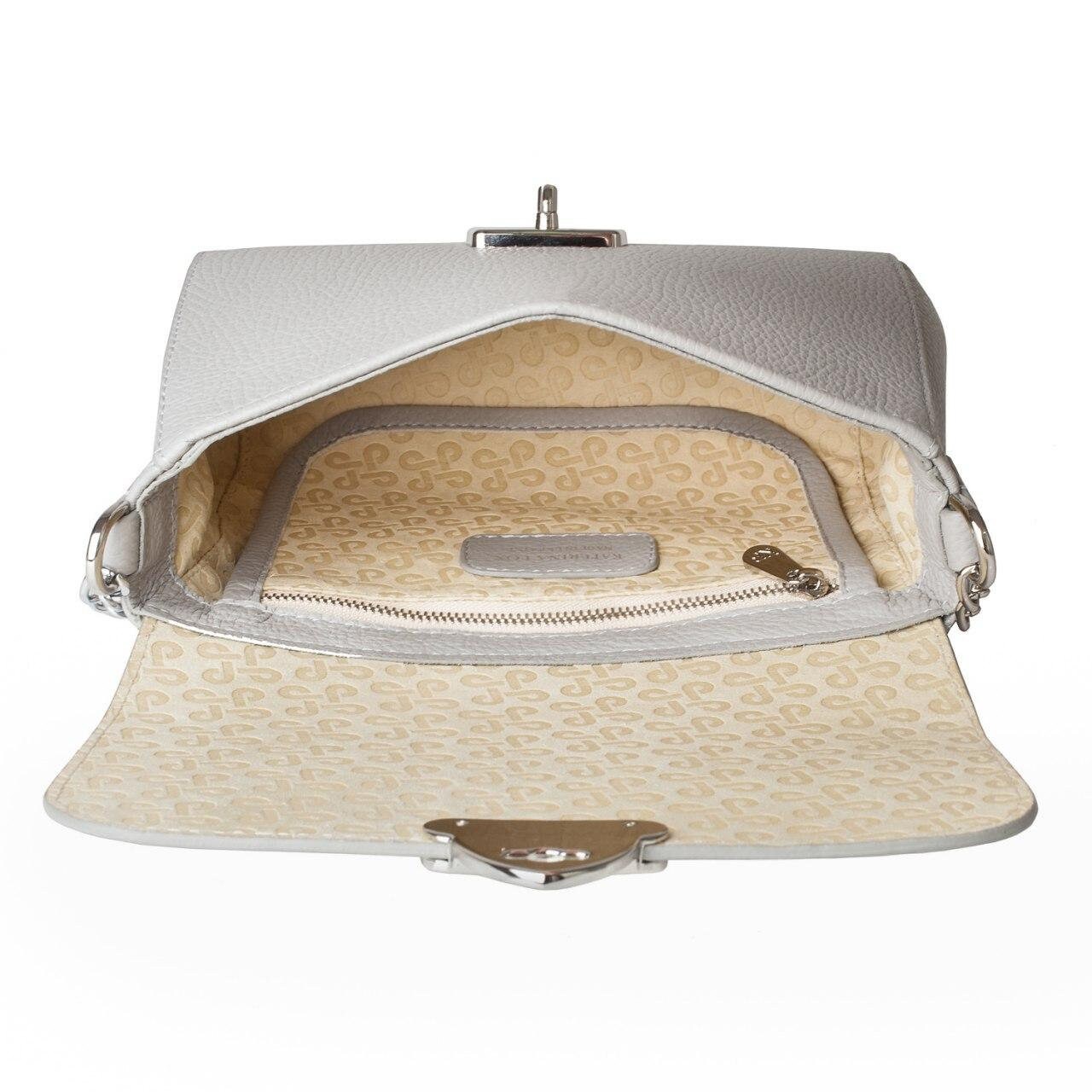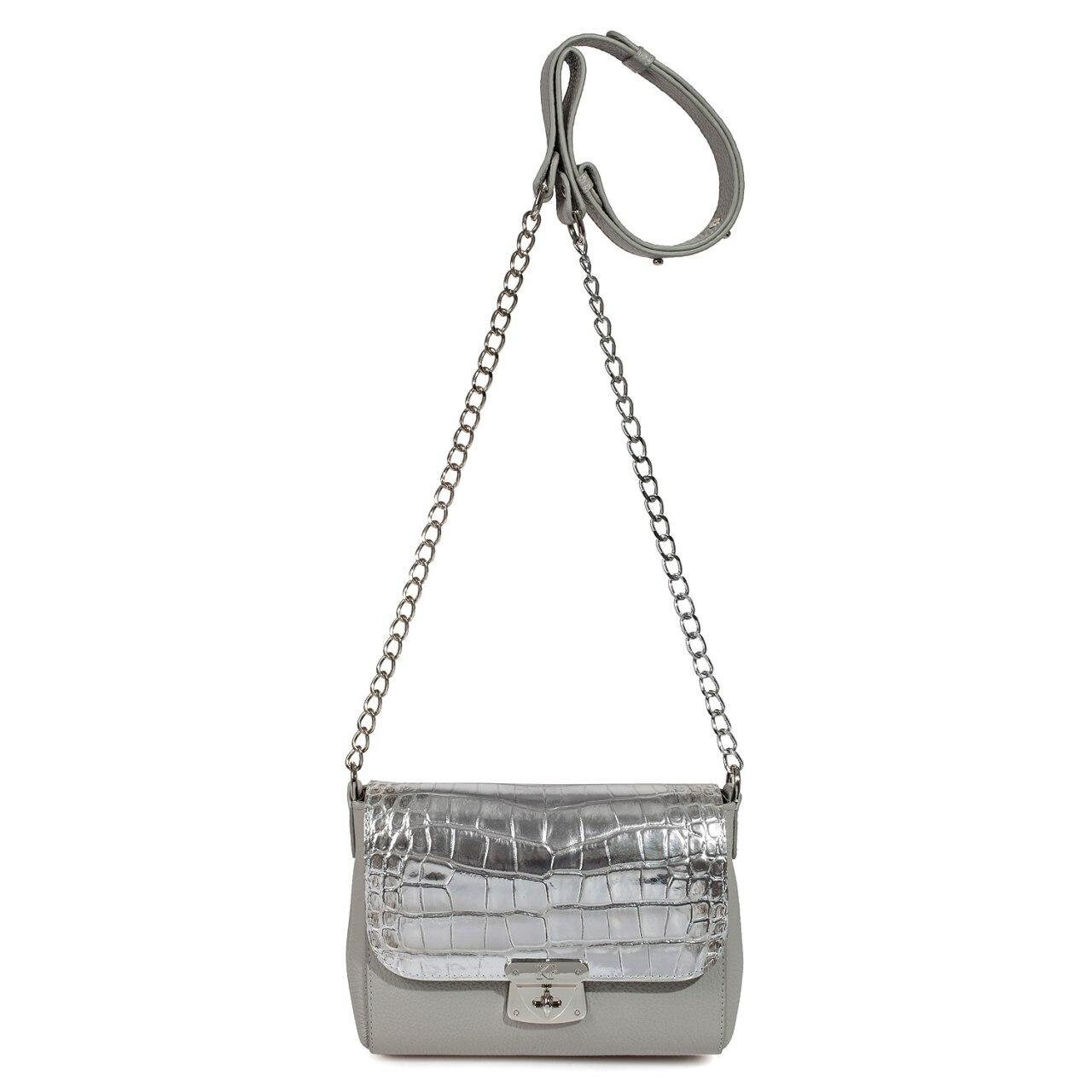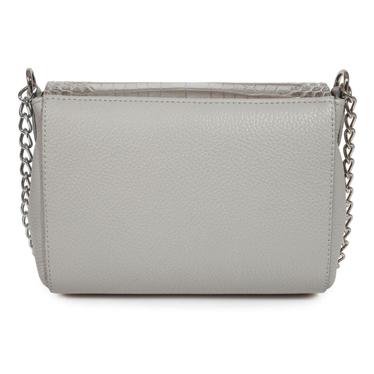 Grey genuine leather woman shoulder bag from ukrainian designer Katerina Fox. Fashionable and elegant modern bag KF for bright girls and women. This bag is able to attract attention and highlight your exquisite taste. Inside the bag is one large compartment and a convenient zippered pocket for small items, closes the bag on the clasp. The bag is comfortable to wear on the shoulder or across the shoulder.