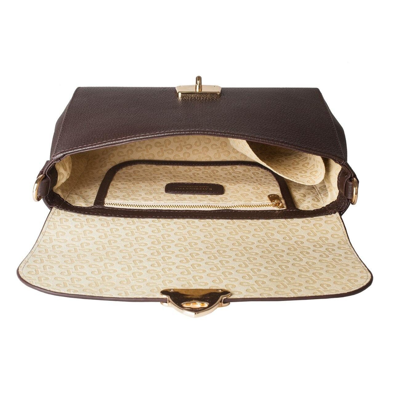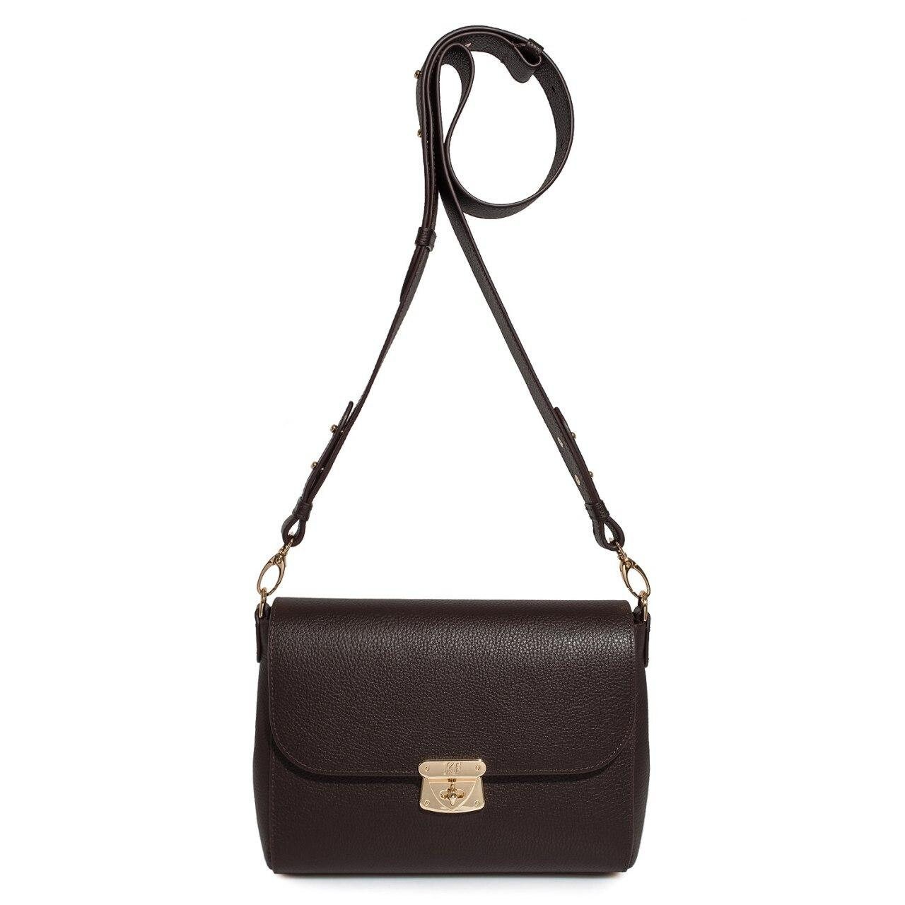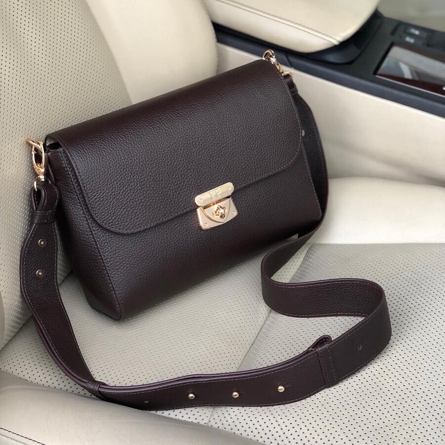 Dark brown genuine leather woman shoulder bag from ukrainian designer Katerina Fox. Fashionable and elegant modern bag KF for bright girls and women. This bag is able to attract attention and highlight your exquisite taste. Inside the bag is one large compartment and a convenient zippered pocket for small items, closes the bag on the clasp. The bag is comfortable to wear on the shoulder or across the shoulder, the handle length is adjustable. If you are planning to buy excellent leather bag at an affordable price, this handbag is the right choice!